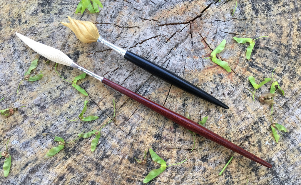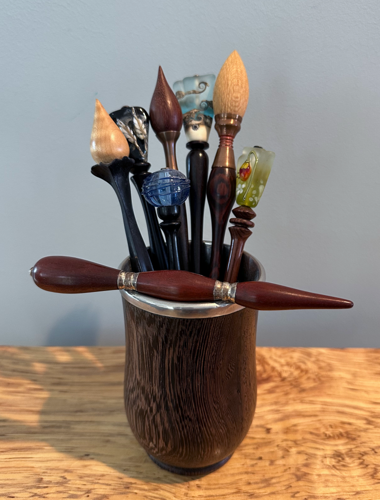 The photos above show a few hair sticks with silver or copper ferrules. I made them by holding sterling silver or copper tubing between mandrels on the lathe and used a scraper burnishing tool with a special tool rest to push upwards and sideways against the tube as it spun to create tapers and decorative shapes.