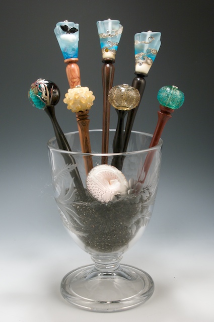 Hanssen Studios became a business when the company I was working for in 2008 went bankrupt and my wife Betty suggested we make a product together. She had been making lamp work glass beads for several years and she thought we could make hair sticks that combined her glass with my woodturning.