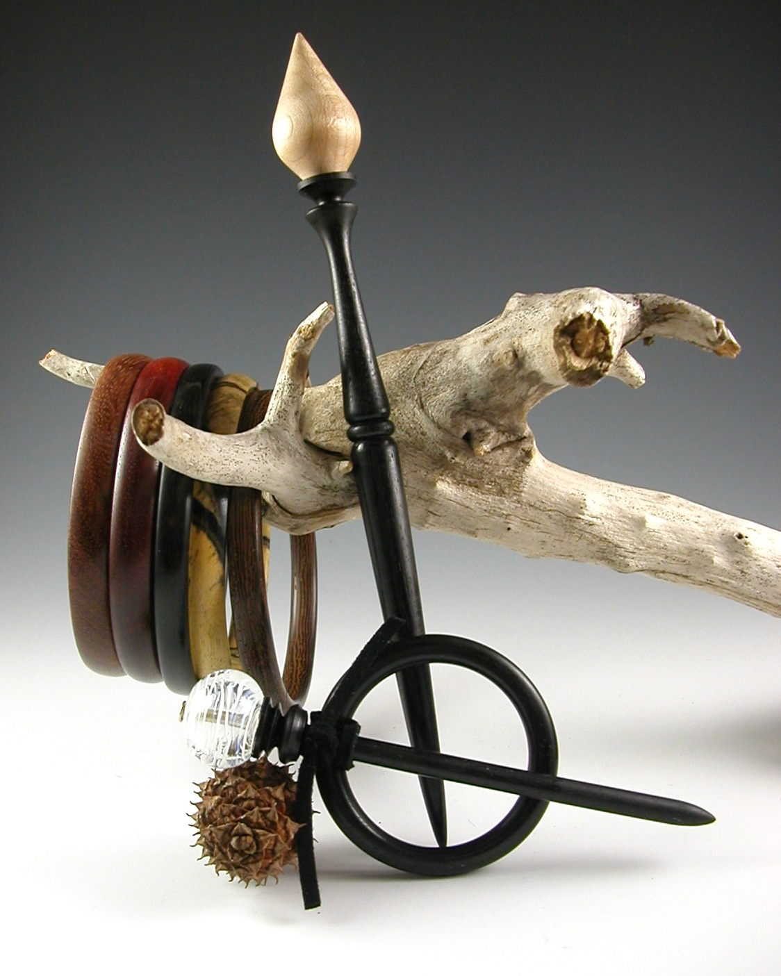 During our run, we sold more than two hundred hair sticks made from wood, glass, silver, and copper; every one unique. I used about 30 different kinds of wood and also made bracelets, shawl pins, silver and copper jewelry, and decorative items. We stopped actively selling when I found conventional employment again.
