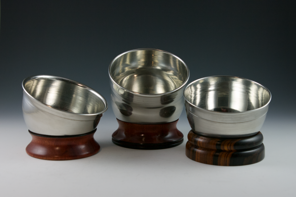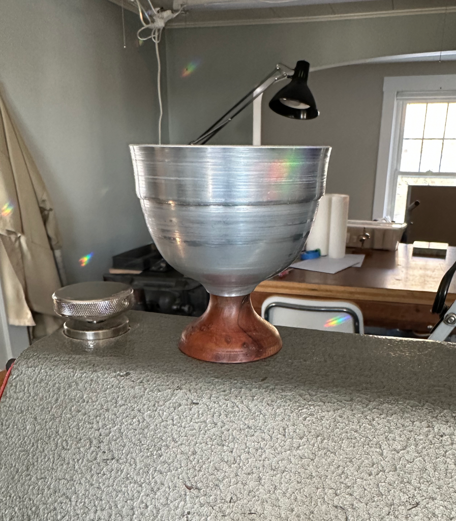 Although I had heard of metal spinning, I had no idea how to do it so I bought Terry Tynan’s Metal Spinning Workshop DVDs. I set up my wood lathe to function as a metal spinning lathe and tried out a number of ideas. The photos below show some of the things I figured out. The process overviews are quite brief so please let me know if you have any questions or comments.