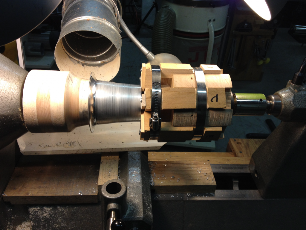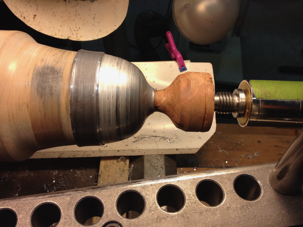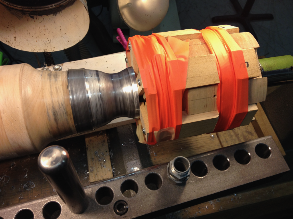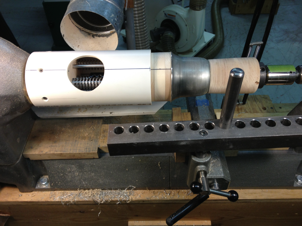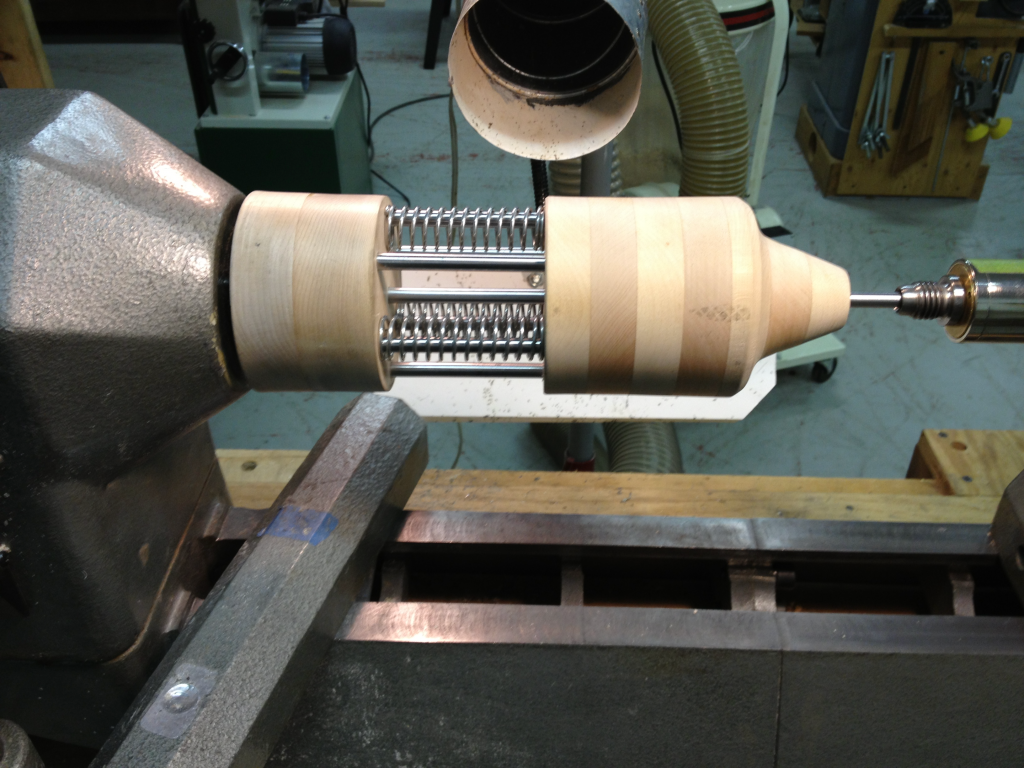 I made several vessels that were held between centers and worked freehand. A piece can change length significantly during this process so I made a spring-loaded mandrel to support the work while allowing its shape to change. A steel rod is held by the base of the assembly and extends forward through the center of the movable portion to hold the base of the piece firmly against the follower block.