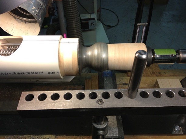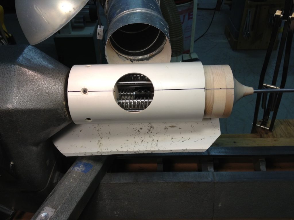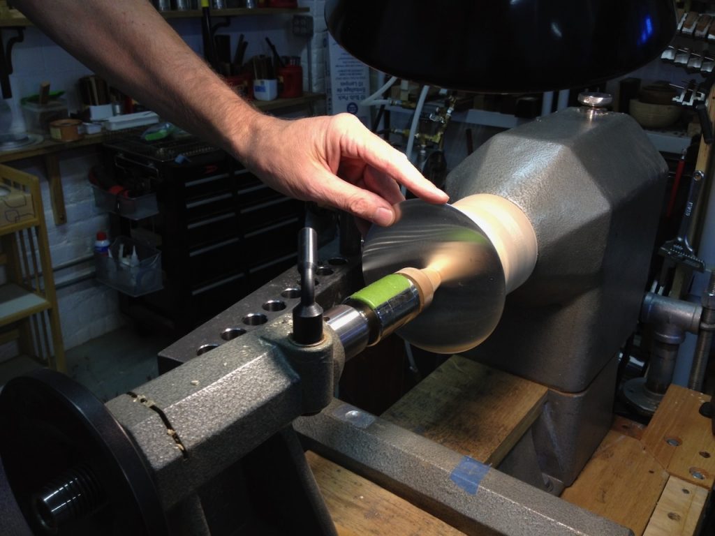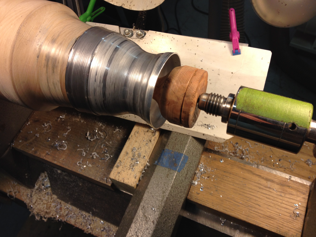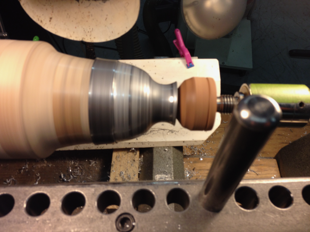 I made several vessels that were held between centers and worked freehand. A piece can change length significantly during this process so I made a spring-loaded mandrel to support the work while allowing its shape to change. A steel rod is held by the base of the assembly and extends forward through the center of the movable portion to hold the base of the piece firmly against the follower block.