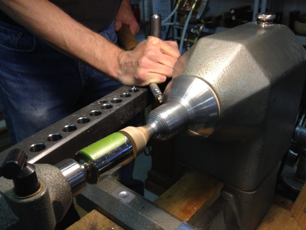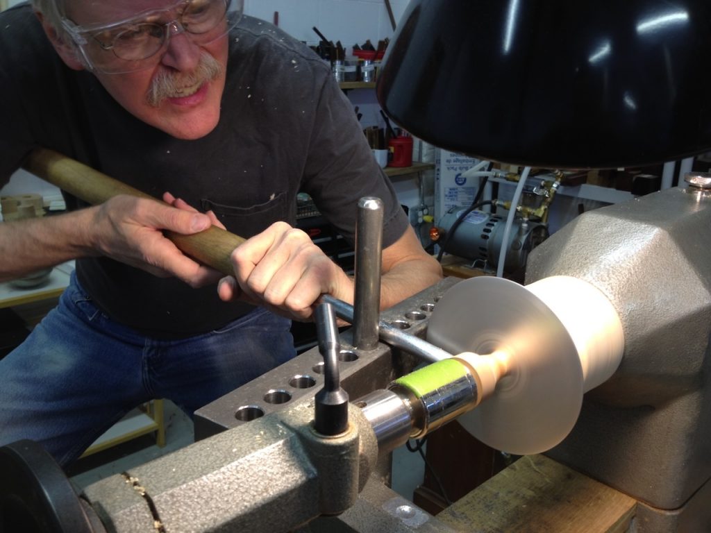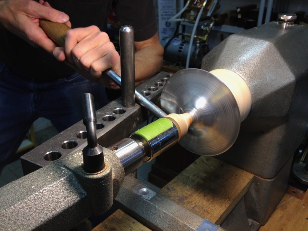 Wax is applied as a lubricant to the spinning disk and a metal rod is pushed against the metal, working from the center out.