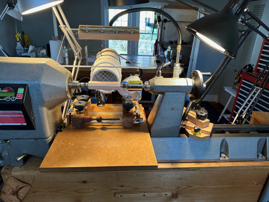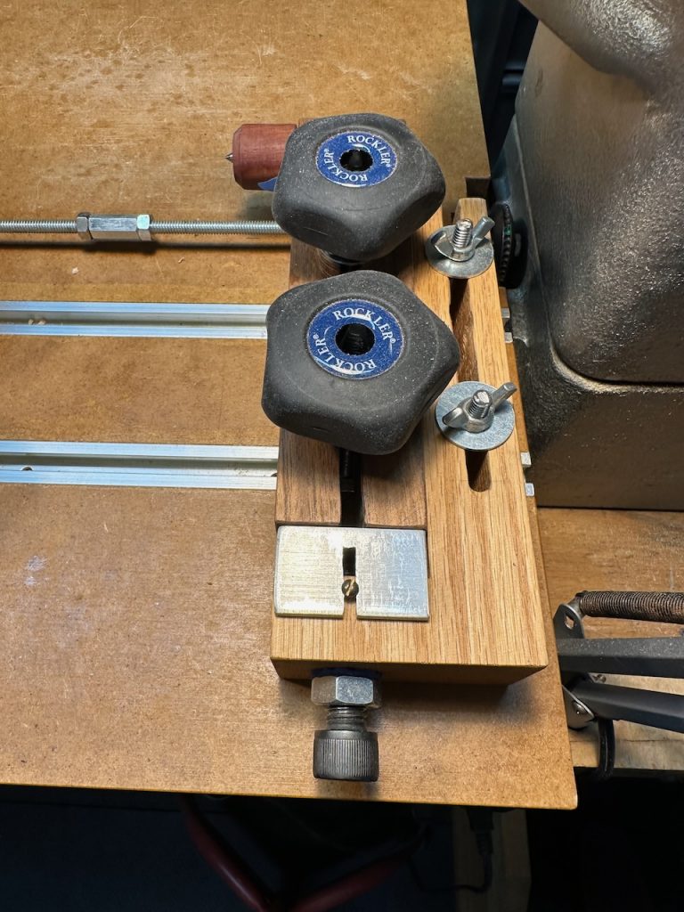 The pattern holder on the bottom has to be precisely aligned with the lathe spindle. A screw on the edge of the table allows for precise positioning along the length of the lathe bed. The center supports were moved in and out by screws until a piece of aluminum foil wouldn’t fit between the square and either alignment bar.