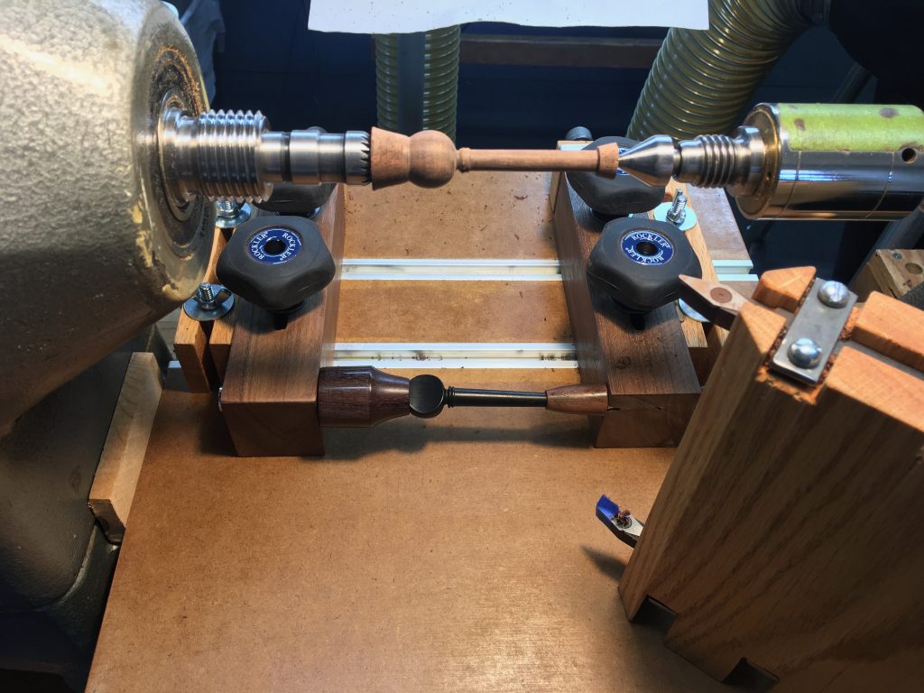 I used the center holders I had originally built for tapering table legs and added a way to precisely move them to align with the lathe spindle.