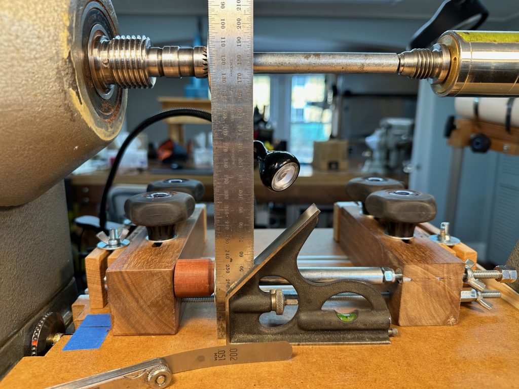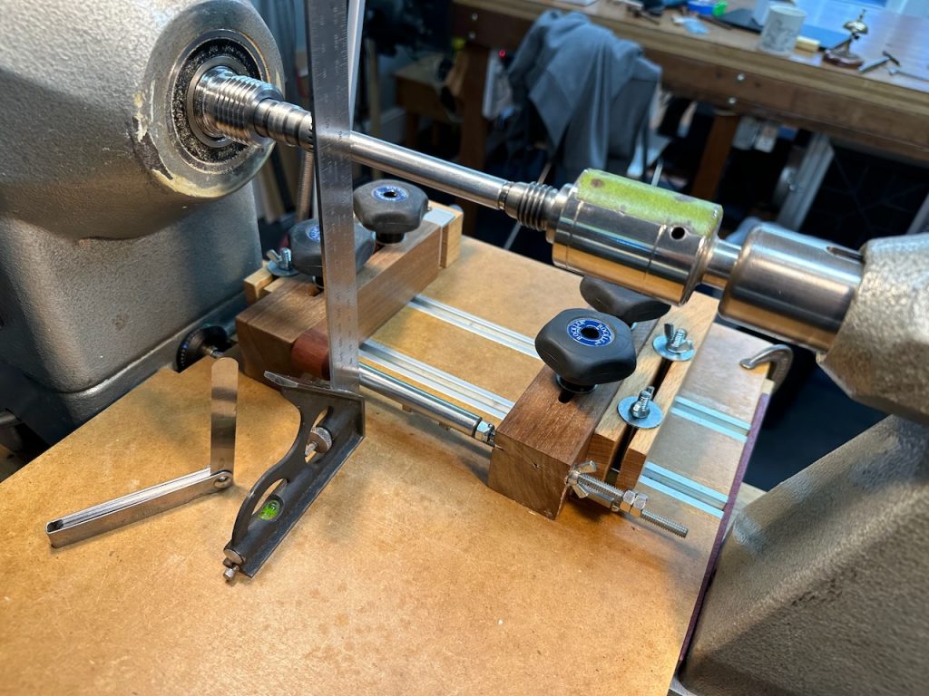 I built a table that securely sits on top of the lathe bed and is held in place with shims and an alignment screw.