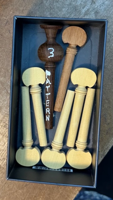A friend was building a viola da gamba for a client and asked me if I would like to have a go at making tuning pegs for it. I made a few prototypes and delivered the boxwood pegs shown installed in instrument here. They were originally a light yellow color and were darkened using nitric acid.